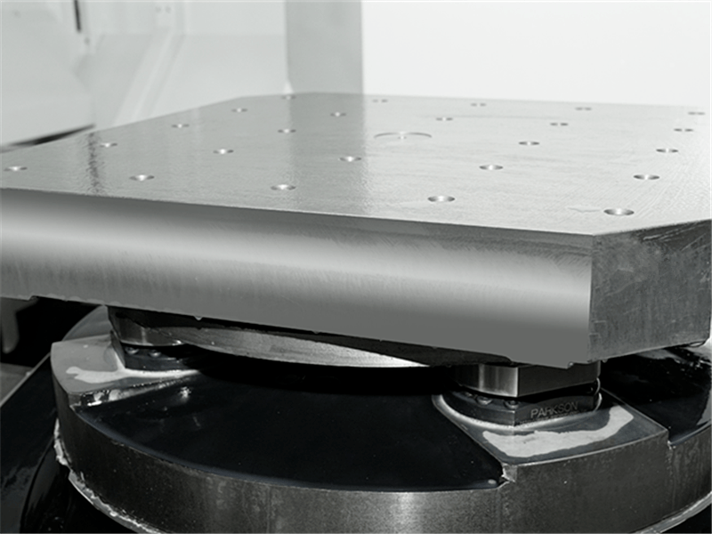 工作臺板與底座間采用四個大定位銷定位,同時兼具夾緊功能,可保證托盤剛性夾緊和精確定位,托盤的重復(fù)定位精度高。工作臺旋轉(zhuǎn)采用高精度牙盤定位,分度精度高、承載大。